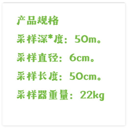 采樣深-度:50m。 采樣直徑:6cm。 采樣長(zhǎng)度:50cm。 采樣器重量:22kg