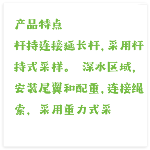 桿持重力兩用設(shè)計(jì),使用方便靈活。 ―――淺水(水深小于5m)區(qū)域,拆除尾翼和配重,連接延長(zhǎng)桿,采用桿持式采樣。 ―――深水(水深大于5m)區(qū)域,安裝尾翼和配重,連接繩索,采用重力式采樣。 鎖水設(shè)計(jì),操作簡(jiǎn)單快捷。